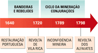 No plano político, o início da mineração acompanhou o sentimento nativista expresso na Revolta de Vila Rica, em 1720, liderada por Felipe dos Santos. No apogeu do ouro, Portugal viveu a Era Pombalina (1750-77). O Marquês de Pombal, ministro do déspota esclarecido D. José, expulsou os jesuítas do Reino, eliminou as Capitanias Hereditárias e mudou a capital para o Rio de Janeiro (1763). O declínio do ouro acompanhou a explosão da arte barroca mineira e as conspirações pela Independência.